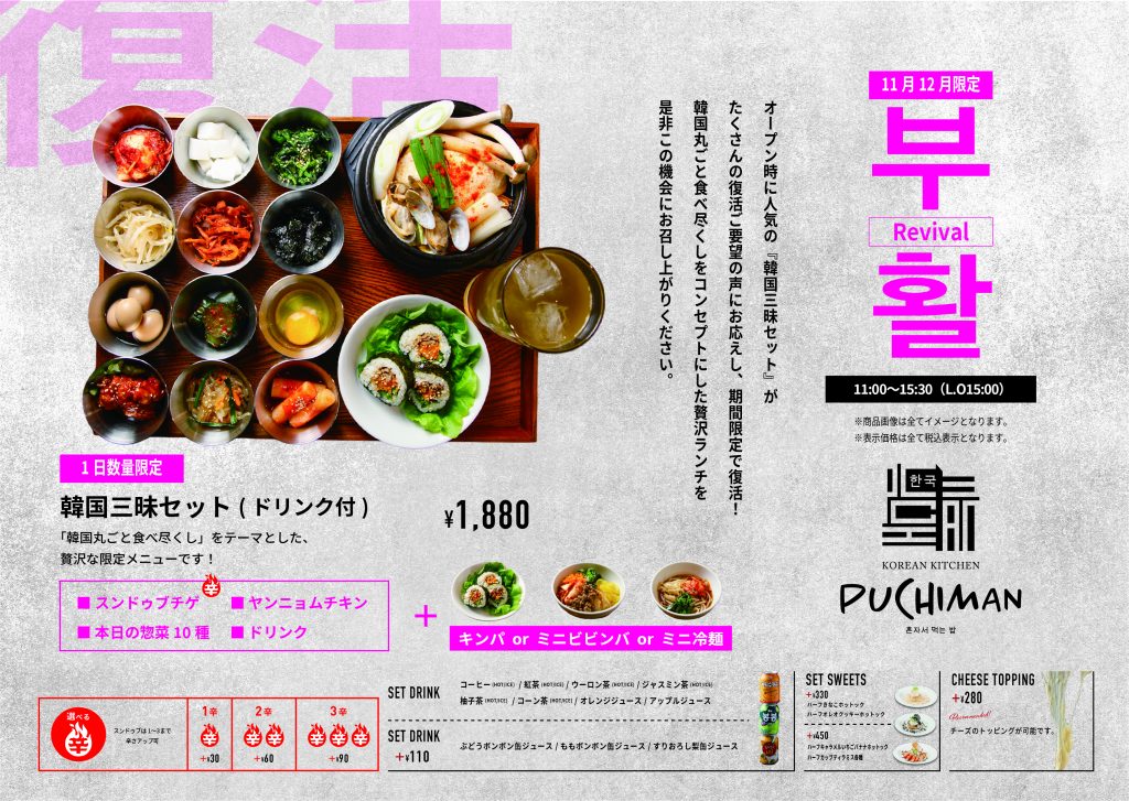 オープン時人気の「韓国三味セット」復活ご要望のお声をたくさんいただき、期間限定で復活!